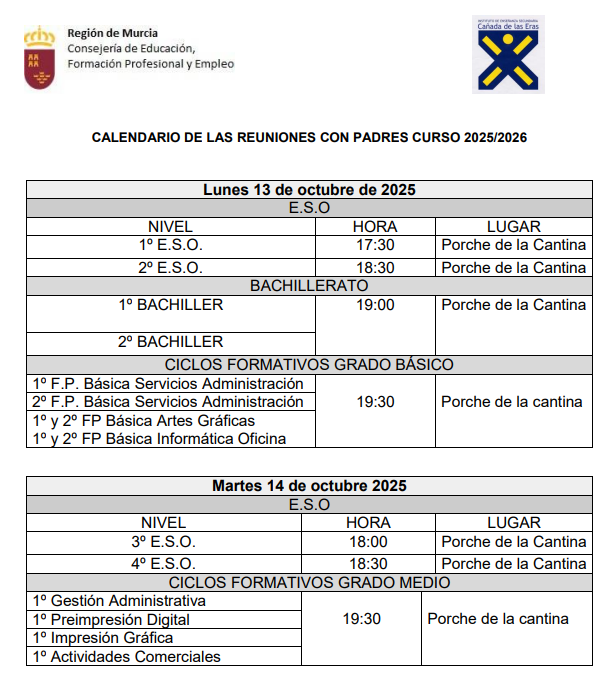 les convocamos a la reunión de inicio del curso académico 2025/2026 en la que serán recibidos por el equipo directivo de nuestro centro, el departamento de orientación y los tutores del grupo de sus hijos. Para saber la fecha y la hora de la reunión de cada grupo, consulten este calendario informativo: