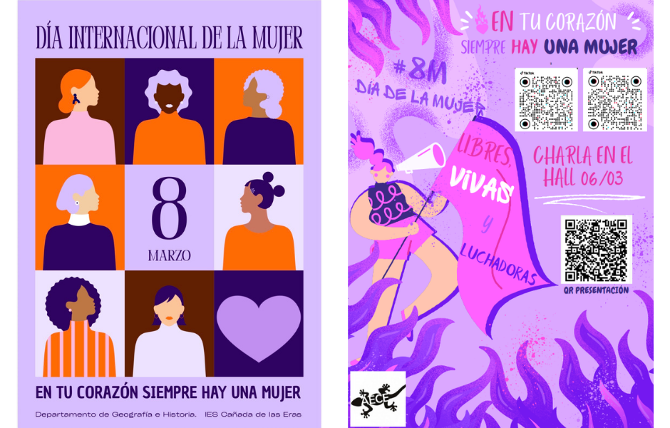 derechos de las mujeres en el siglo XX en España. Lo más destacado es que serán las propias alumnas las que expliquen, a quienes lo deseen, detalles de esta investigación durante el tiempo de recreo en la entrada del IES. Asimismo han recreado vídeos sobre este trabajo, accesibles con códigos QR, y que también aparecerán en las RR.SS. de nuestro Centro. Si desea ver el video que resume su trabajo puede verlo también aquí:➡️ Video Día de la Mujer